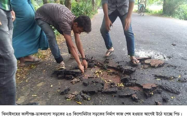 ঝিনাইদহ কালীগঞ্জ-ডাকবাংলা সড়কের ২৩ কিলোমিটার সড়কের নির্মাণ কাজ শেষ হওয়ার আগেই উঠে যাচ্ছে পিচ। ২৩ কিলোমিটার এ সড়ক নির্মাণের কাজে ব্যাপক অনিয়মের অভিযোগ উঠেছে। সরেজমিনে সোমবার সকালে দেখা গেছে, ২৩ কিলোমিটার সড়কের মধ্যে ৪ কিলোমিটার রাস্তায় পিচ ঢালাই দেওয়া হয়েছে। ঢালাইয়ের পাঁচদিনের মাথায়...... বিস্তারিত >>